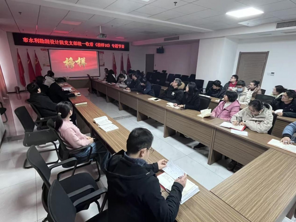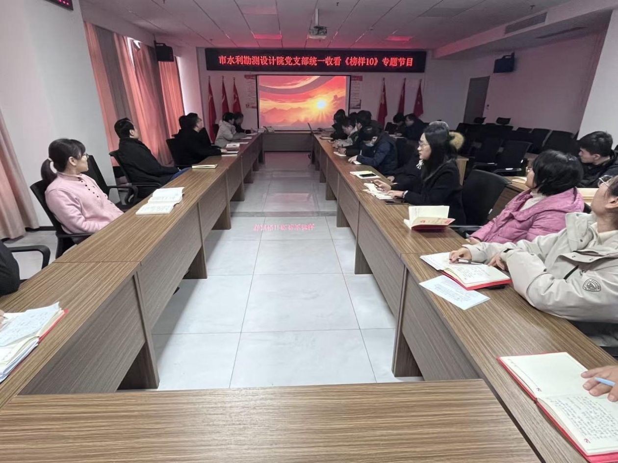 近日,设计院党支部组织全体党员干部职工集中观看《榜样10》专题节目,接受深刻的党性教育和精神洗礼。该节目展现了茹振钢等优秀共产党员及先进党支部的感人事迹,他们扎根岗位、深耕细作、践行初心的精神,与水利设计人履职尽责、攻坚克难的使命高度契合,让在场全体人员深受触动、倍感振奋。